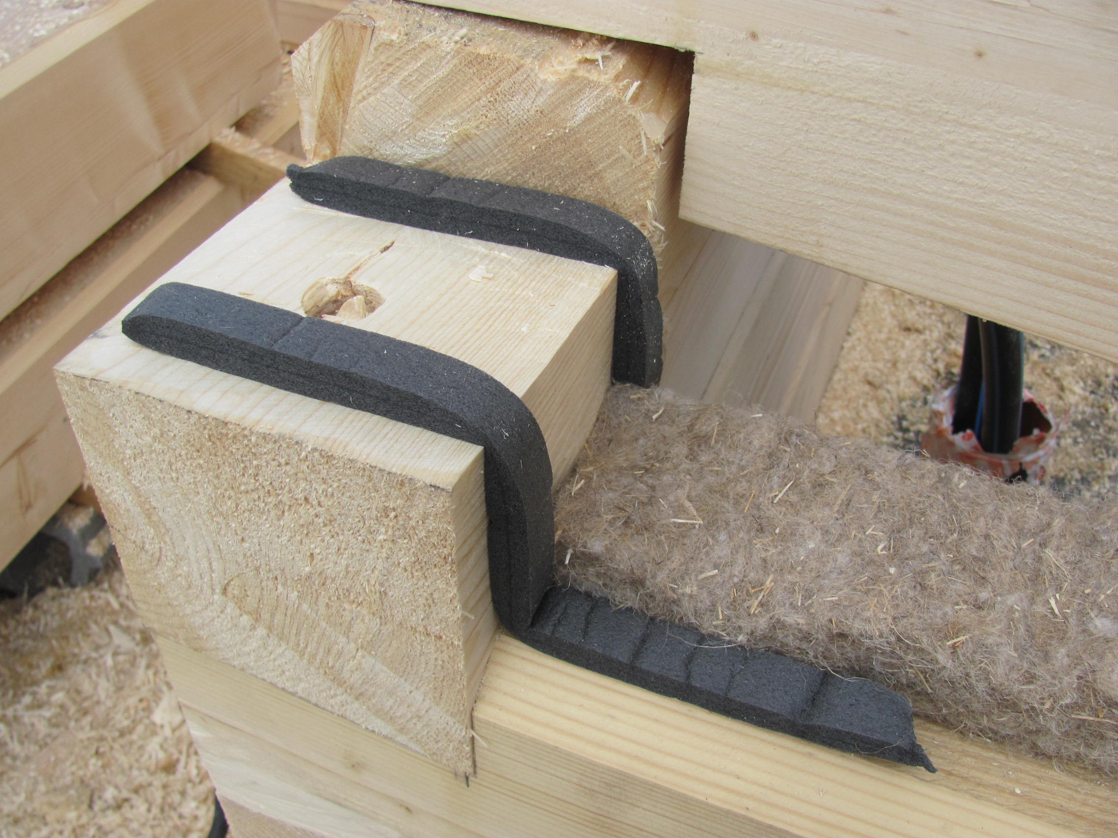 Für Holzbauten aus profilierten Balken bieten wir selbstklebende Bänder aus PE-SOFT-Material an. Dieses Material füllt die Lücken in den Nuten und Verbindungszapfen aus und verbessert die Wärmedämmeigenschaften des gesamten Gebäudes.