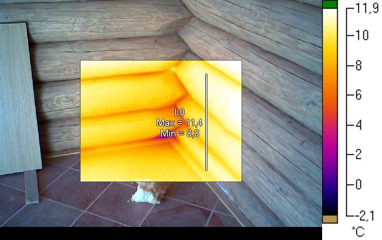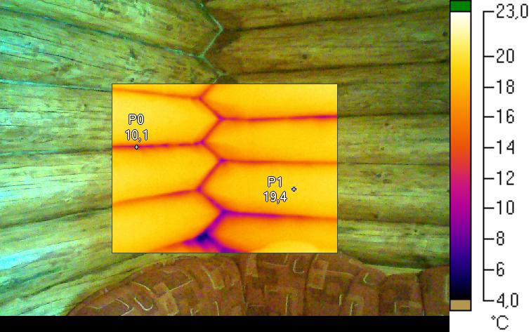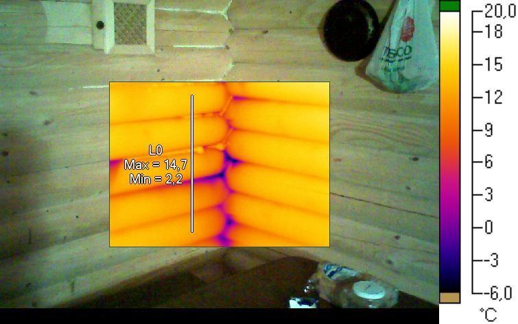 Obr. 1. – stavba bez použití jakékoliv izolace – průnik chladu mezi trámy v zámcích je jasně zřetelný